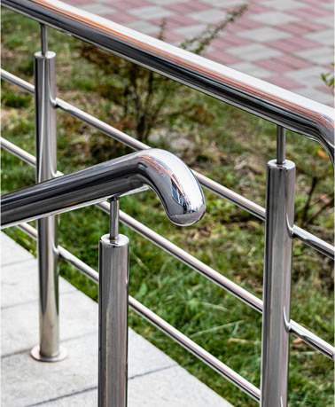 白鐵(不鏽鋼)材質,耐候、防鏽、好保養,常見於室外欄杆、樓梯扶手與公共空間使用。